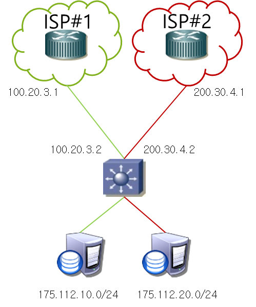ip access-list 100 permit ip 175.112.20.0/24 < ISP 2 방향 출발지 IP >