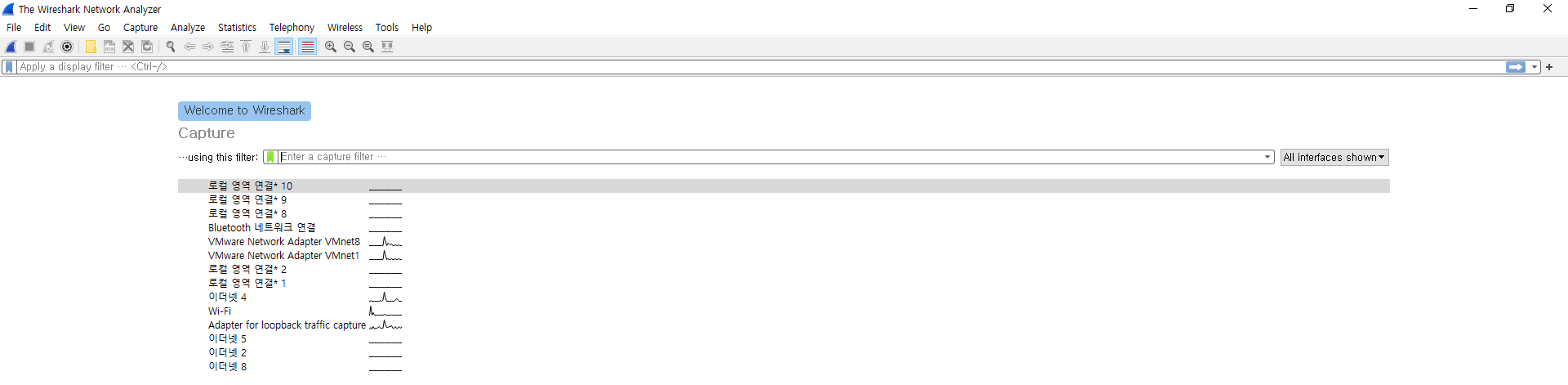 모니터링 포트에 연결된 이더넷 어뎁터를 클릭하시면 패킷 캡처를 시작합니다.