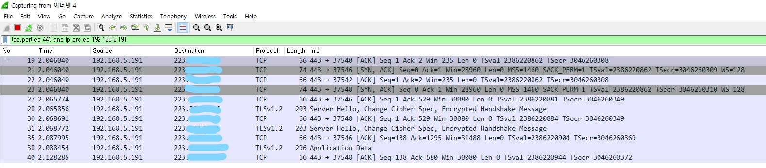 3-2) 192.168.5.191에 https(443) 패킷을 필터링하여 봅니다.