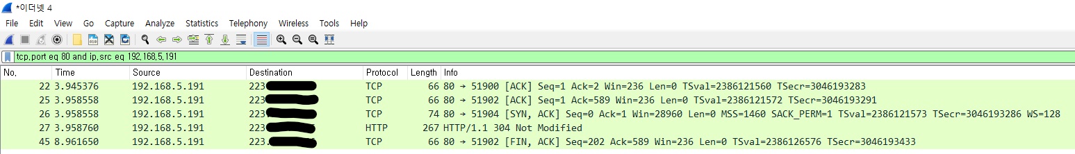 3-1) 192.168.5.191에 http(80) 패킷을 필터링하여 봅니다.