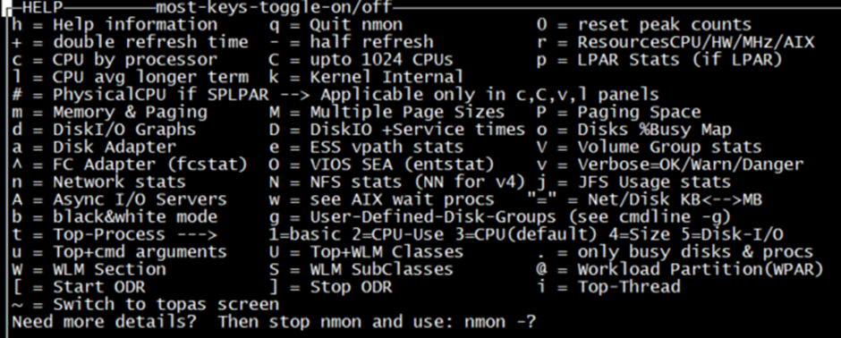 h = Help information q = Quit nmon 0 = reset peak counts