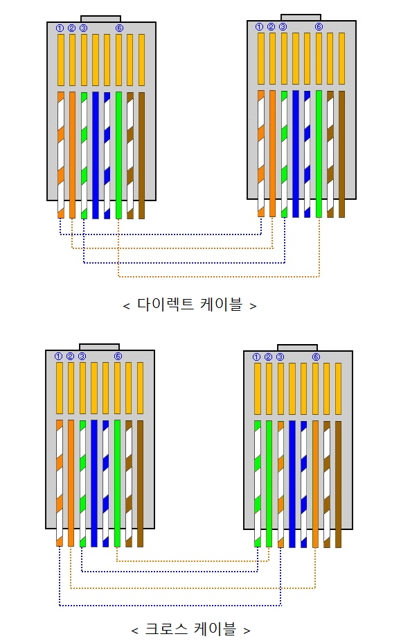 T-568A, T-568B를 케이블 양 끝단에 어떻게 배열하냐에 따라 다이렉트 케이블과 크로스 케이블로 케이블로 구분할 수 있는데 , 양 끝단에 동일한 유형으로 배열하면 다이렉트 케이블, T-568A와 T-568B로 배열하면 크로스 케이블이 된다.