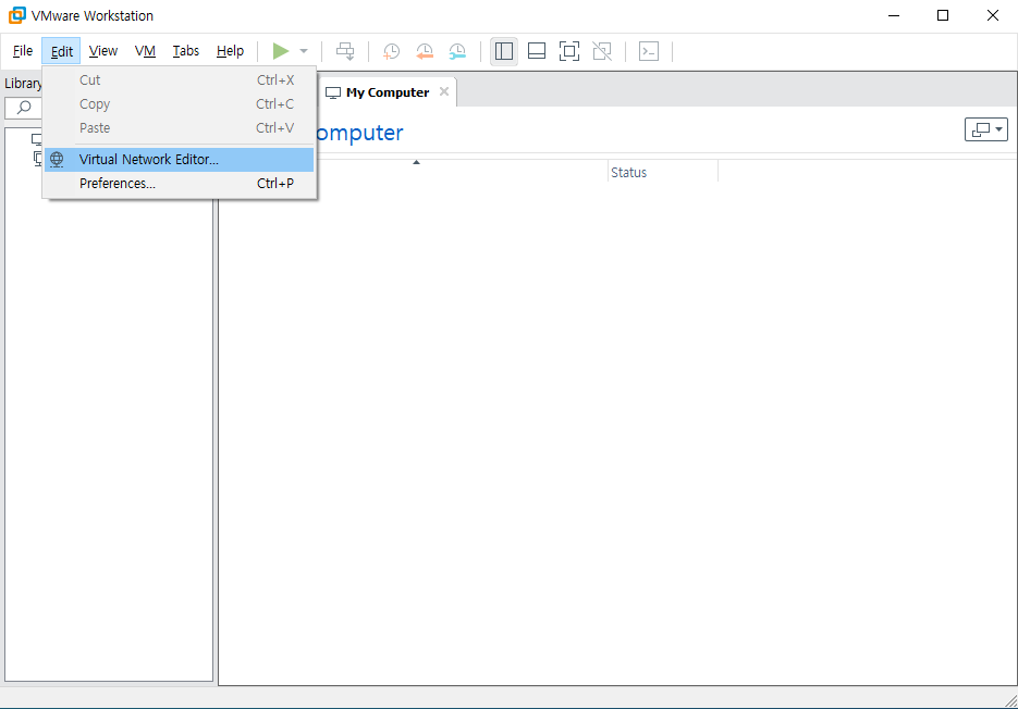 vmware workstation(이하 vmware)을 실행시키고 Edit -> Virtual Network Editor 메뉴로 들어간다.