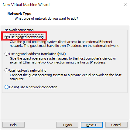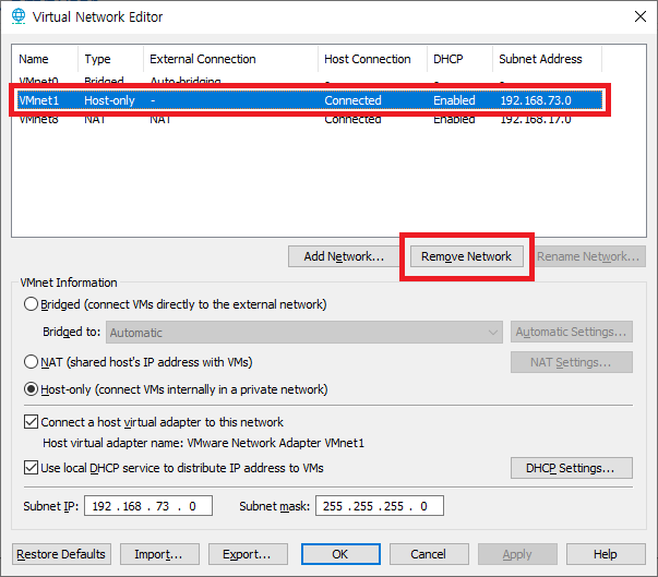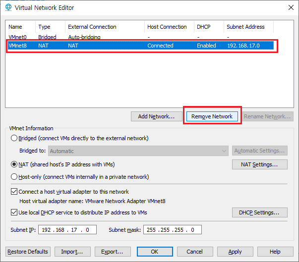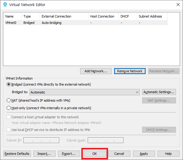 'Change Setting'을 클릭하고 Bridged(VMnet0) 네트워크만 남기고 Host-only(VMnet1)와 NAT(VMnet8) 네트워크는 모두 삭제한다. 굳이 삭제를 하지 않으려면 VMnet1과 VMnet8의 체크박스의 체크된 'Connect a host Virtual adapter to thish network'와 Use local DHCP service to distribute IP address to VMs' 2개의 항목에 체크를 해제 한다.