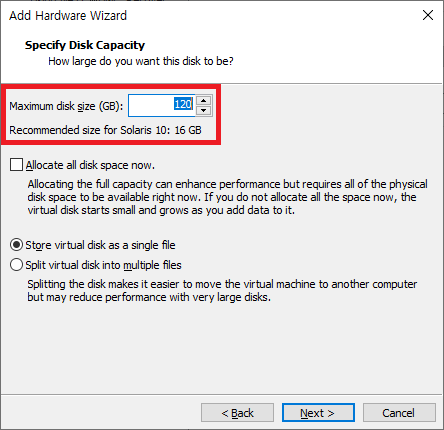 디스크 용량은 최소 120GB로 설정 해준다. HMC V9 버전 설치시 최소 필요한 용량은 120GB 이고