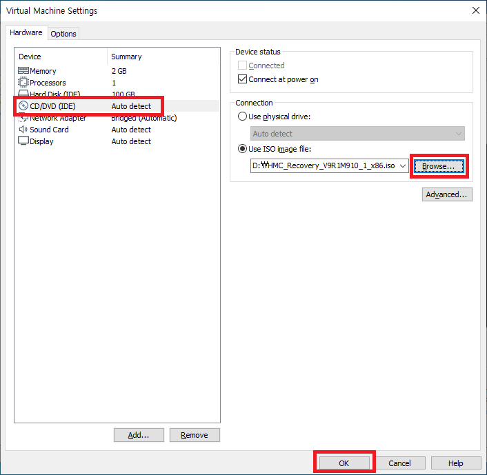 VM생성이 완료 되면 HMC ISO 파일을 마운트 한다