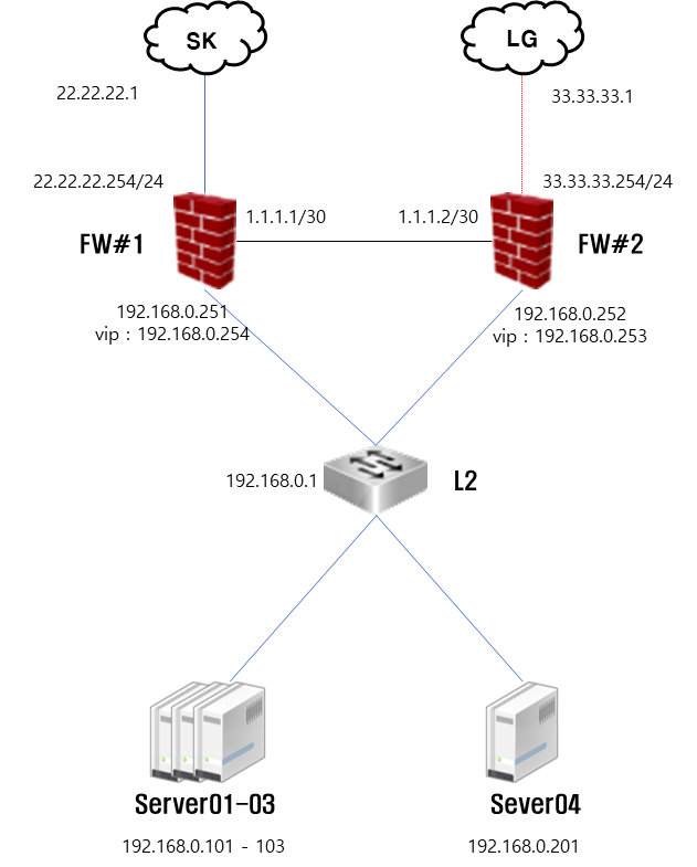 1) Server 01-03의 게이트웨이 : SK쪽 FW의 VIP 192.168.0.254