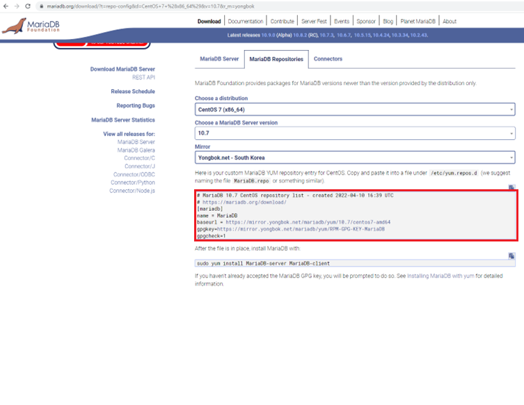 https://mariadb.org/download/?t=repo-config&d=CentOS+7+%28x86_64%29&v=10.7&r_m=yongbok