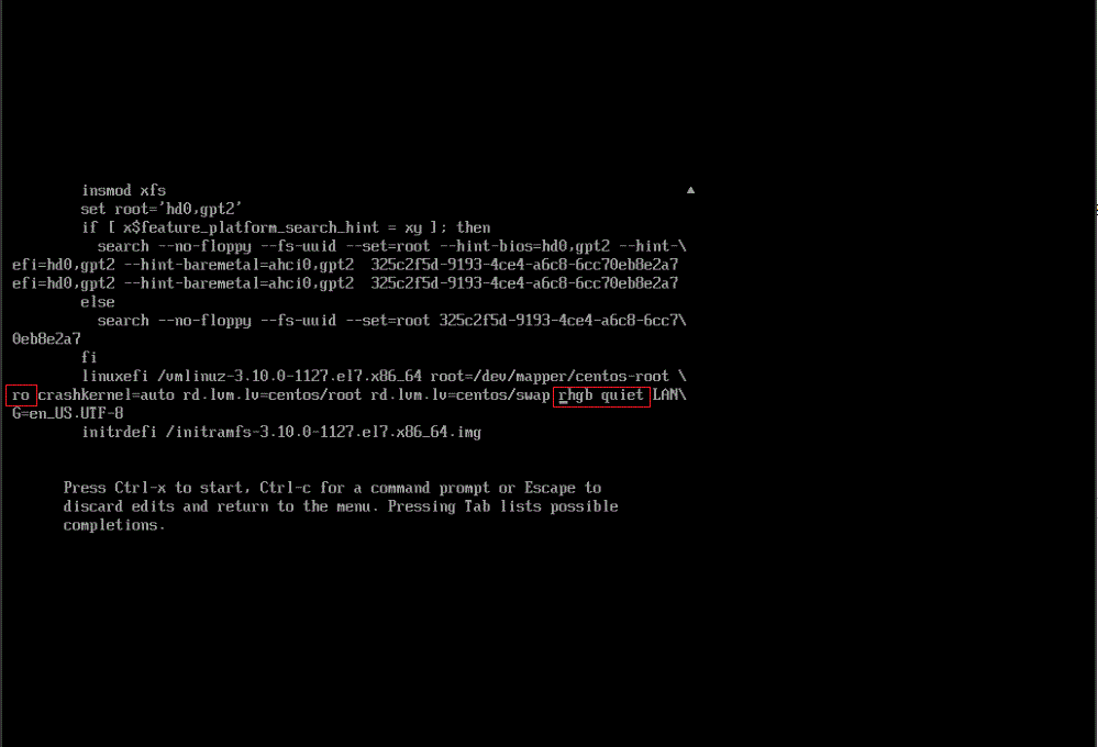ro -> rw , rhgb quiet -> init=/bin/bash