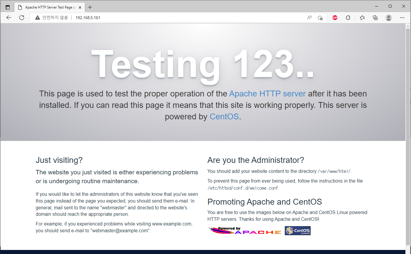 이제 브라우저에서 http://서버ip 를 입력하여 apache test 페이지를 확인합니다.