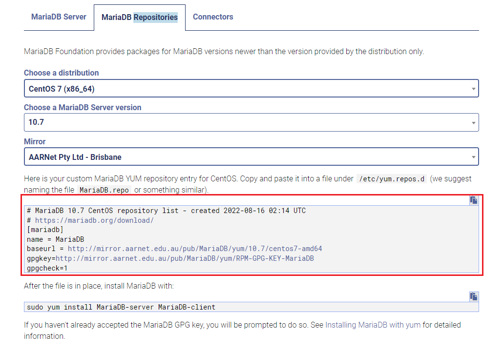 https://mariadb.org/download/?t=repo-config&d=CentOS+7+%28x86_64%29&v=10.7&r_m=aarnet_pty_ltd
