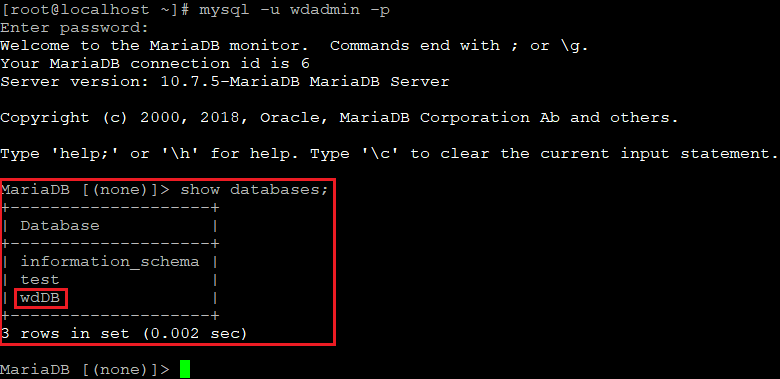 mysql -u wdadmin -p     #wdadmin 계정으로 mariadb를 접속합니다.