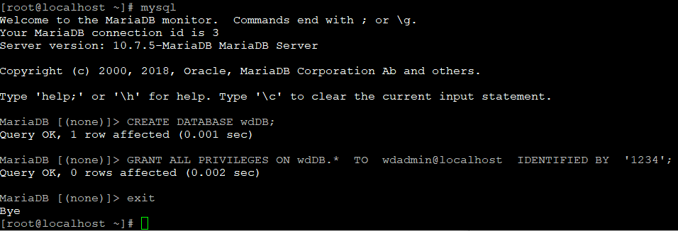 GRANT ALL PRIVILEGES ON wdDB.*  TO  wdadmin@localhost  IDENTIFIED BY  '1234';  #wdDB에 접속 가능한 wdadmin이라는 mariadb 계정 생성(password는 1234로 설정)
