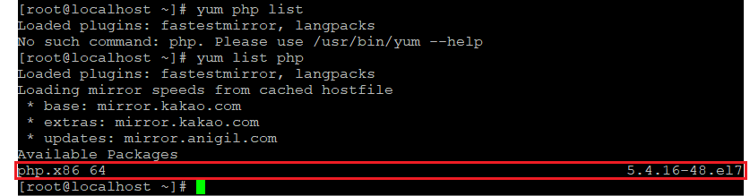 yum php list     #php 버전확인(yum으로 설치 시 5.4 버전의 php가 설치되도록 설정된 것을 확인)