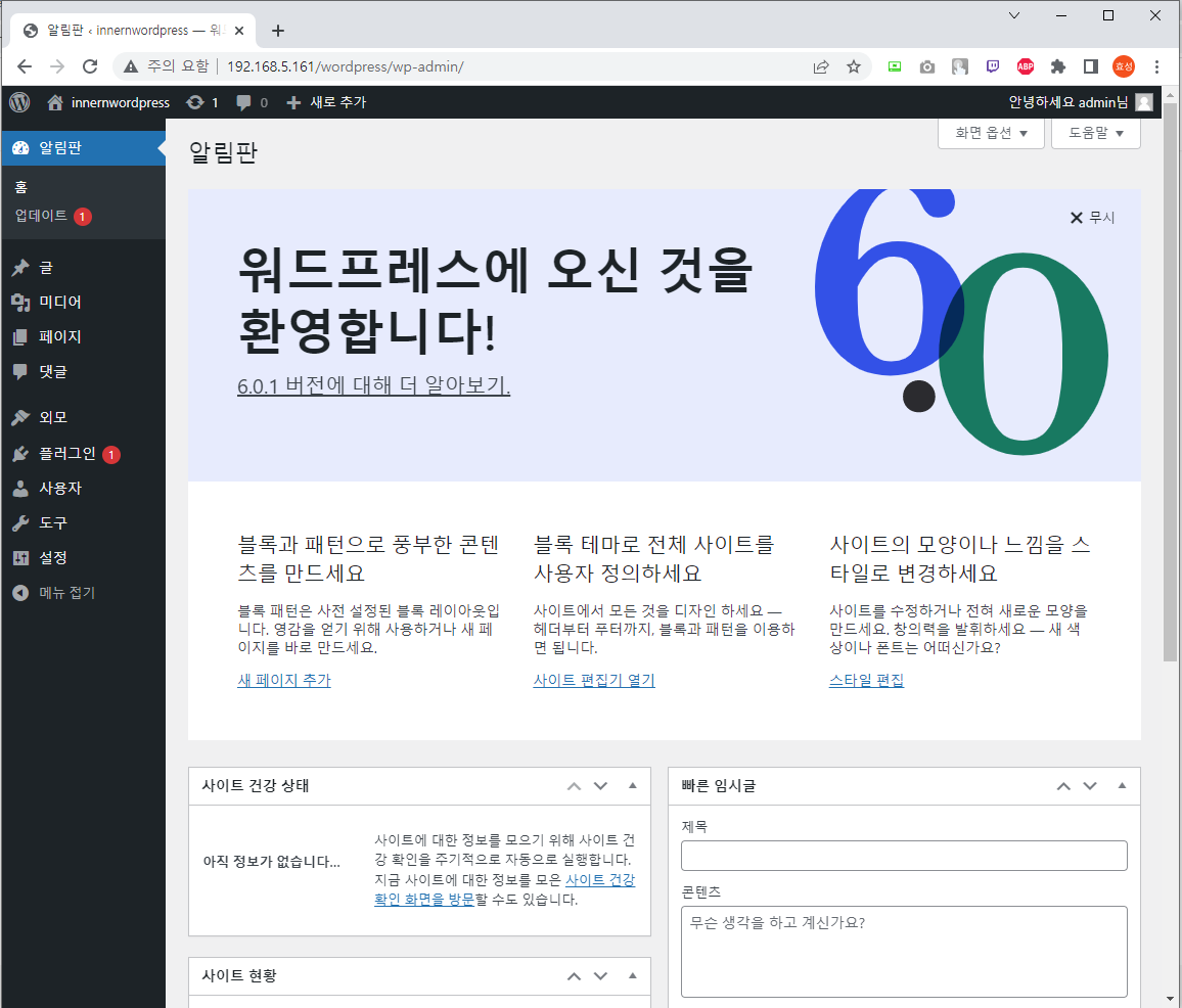 위 화면에 접속이 되면 설치가 완료된 것입니다.