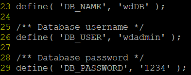 23 define( 'DB_NAME', 'wdDB' );     #해당 줄에 데이터베이스의 이름을 입력합니다.(위에서 생성한 wpDB로 입력)