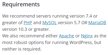wordpress는 php7.4 이상의 버전, mysql 5.7 이나 mariadb10.3 이상의 버전, apache 또는 nginx를 설치해야 됩니다.