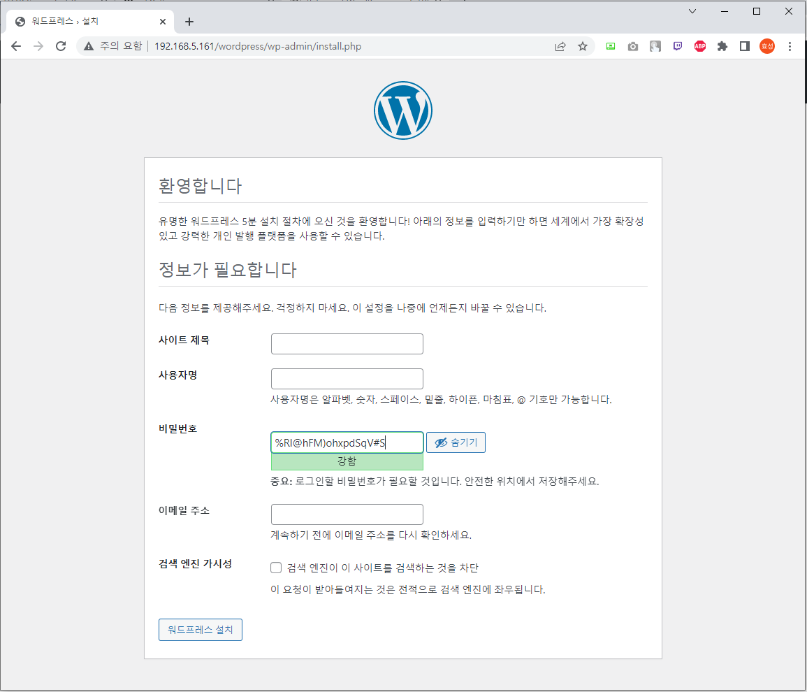 이제 위 화면에서 wordpress 정보를 입력하고  워드프레스를 설치합니다.