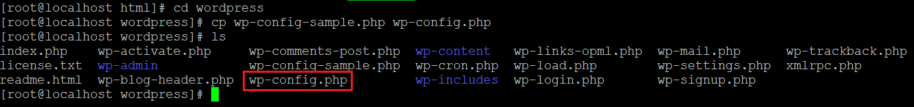 cp wp-config-sample.php wp-config.php     #wordpress 설정 파일 샘플을 wp-config.php로 복사합니다.