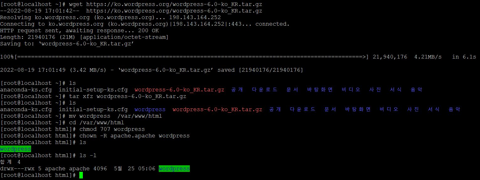 tar xfz wordpress-6.0-ko_KR.tar.gz     #다운받은 wordpress 파일의 압축을 해제합니다.