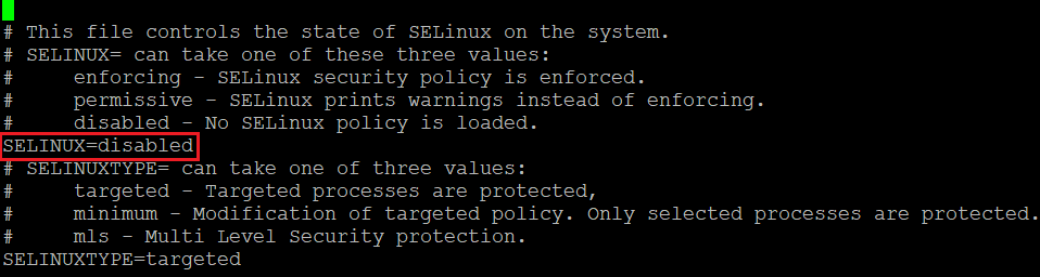 SELINUX=enforcing  - > SELINUX=disabled     #설정 파일에서 SELINUX=enforcing 이라 적혀있는 부분을