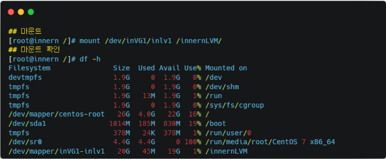 - “/dev/inVG1/inlv1”을 “ext4 “ 포맷을 하였고 디렉터리 생성 후 마운트를 진행하겠습니다.