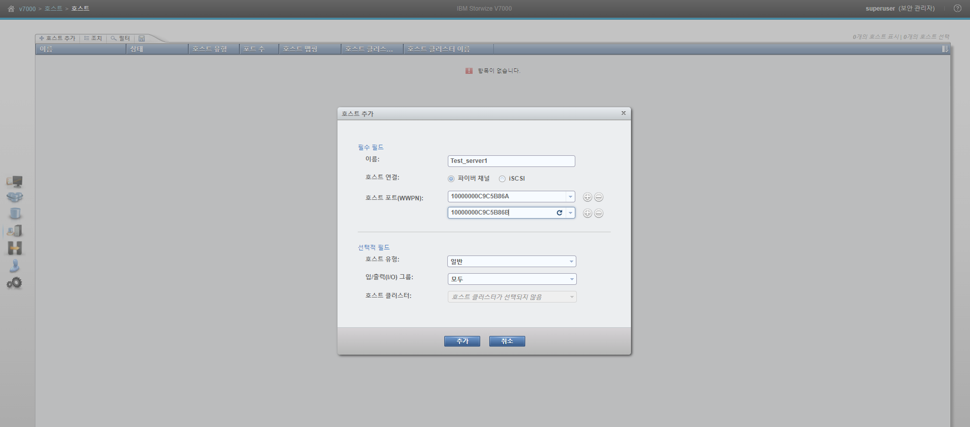 - 스토리지에서 호스트를 추가합니다. 호스트 이름을 정해주고 연결은 파이버 채널이며, 호스트 포트(WWPN)를 추가합니다.