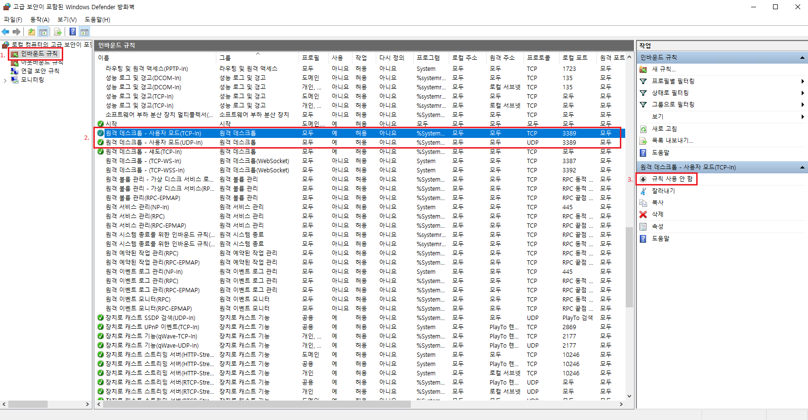 ■ 인바운드 규칙 -> TCP 3389, UDP 3389 찾기 -> 규칙 사용 안함