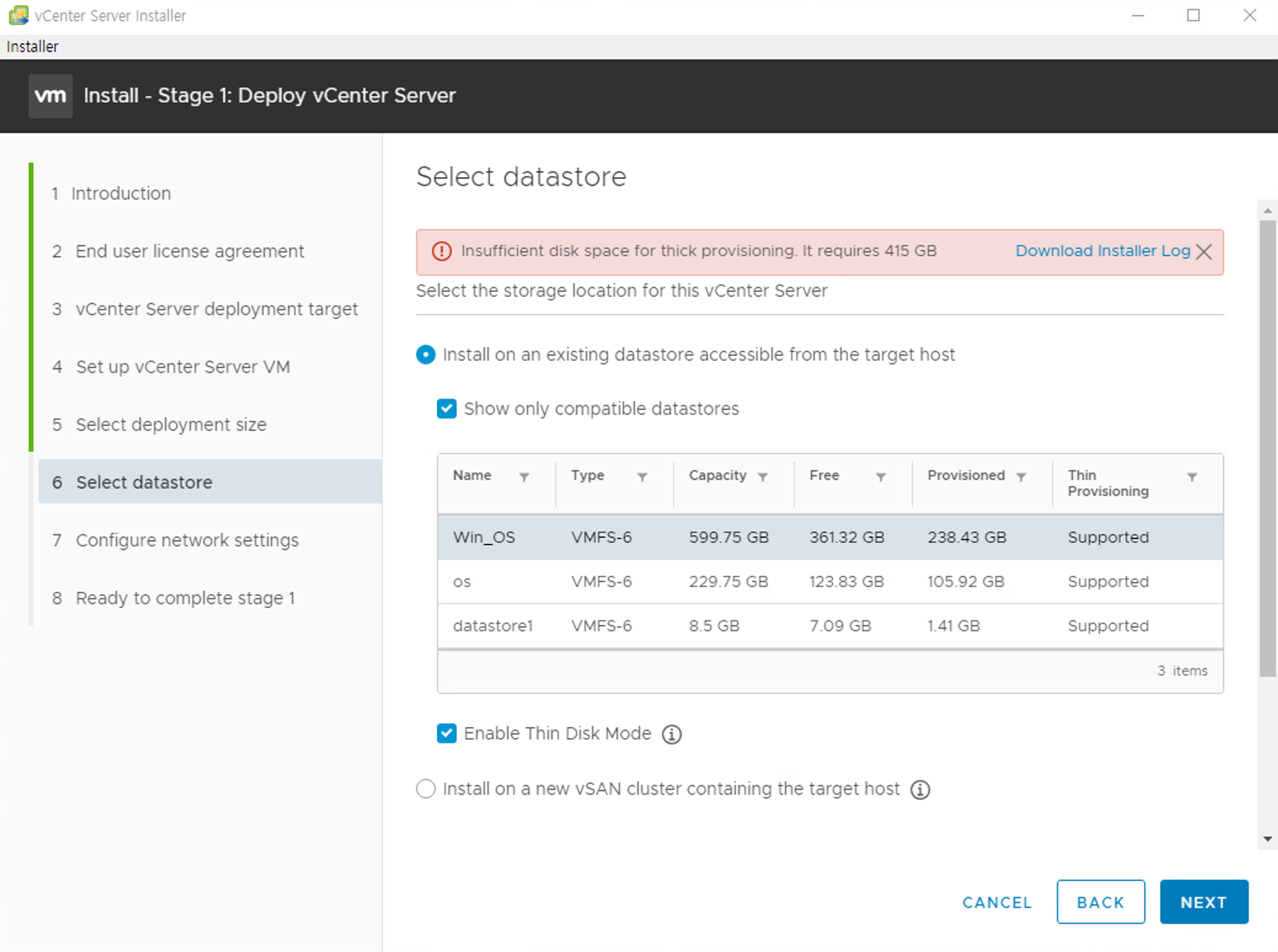 - vCenter Sever 설치할 데이터스토어를 지정합니다.(Thin Disk Mode 활성화를 체크하면 동적디스크로 효율적으로 사용할 수 있습니다.)