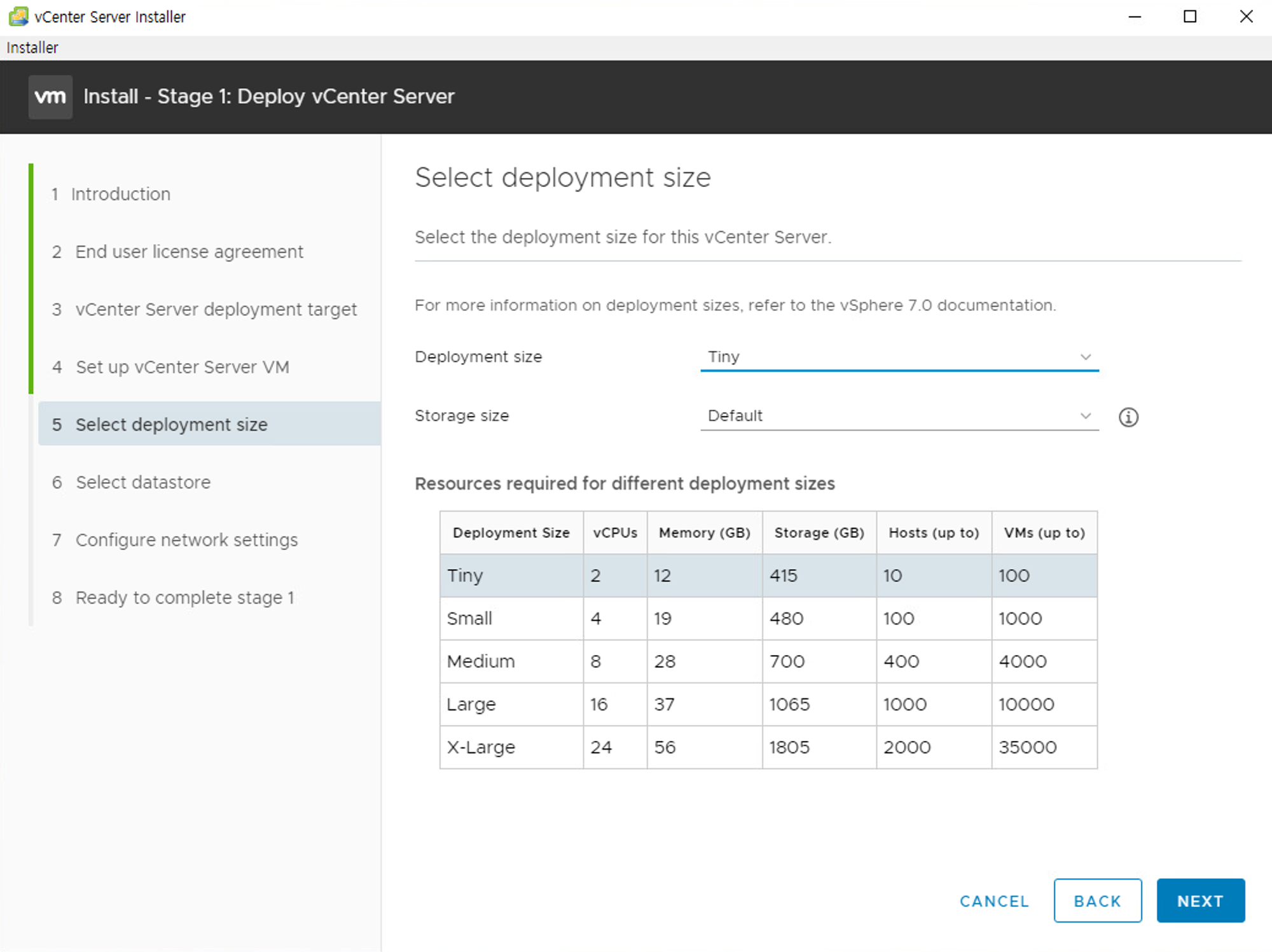 - vCenter Server 설치는 두 단계로 진행됩니다. 첫 번째 단계에서는 vCenter Server를 대상 ESXi 호스트 또는 대상 vCenter Server의 컴퓨팅 리소스에 배포하는 작업이 포함됩니다. 두 번째 단계에서는 배포된 vCenter Server의 설정을 완료합니다.