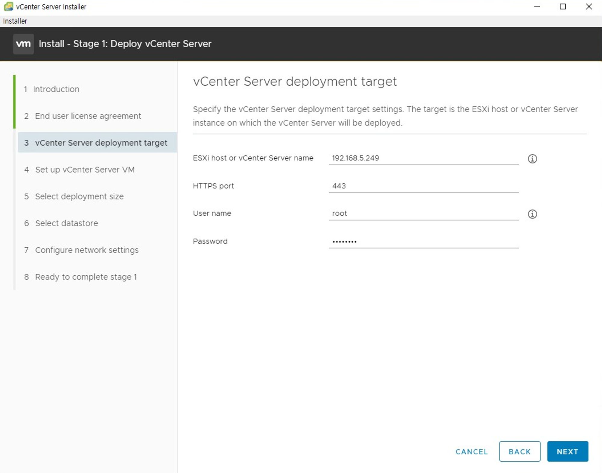 - ESXi 7.0 버전 이상부터는 VM에 vCenter Server 설치합니다. ESXi의 IP 및 계정을 입력합니다.