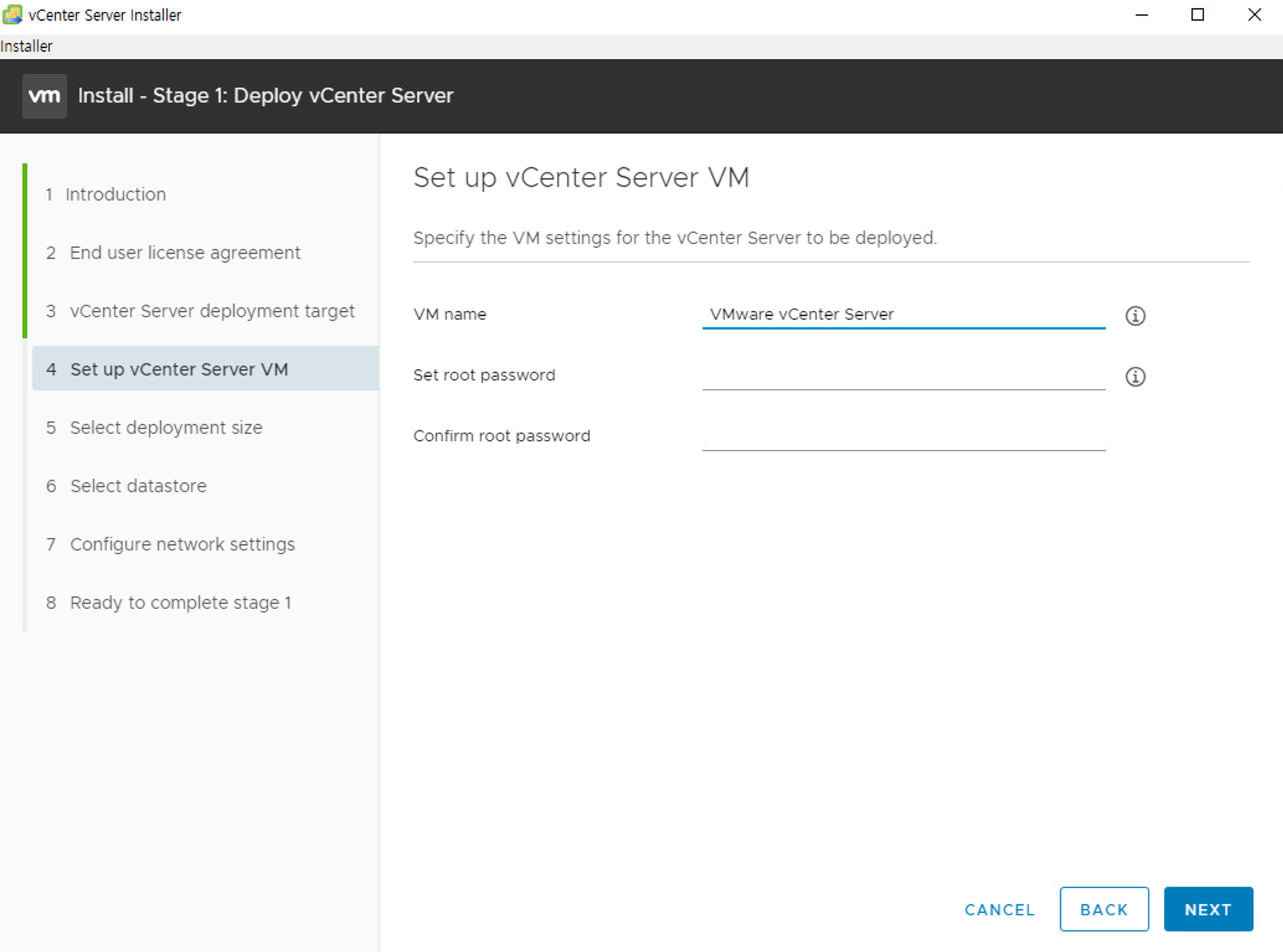 - vCenter Server가 설치되어 생성될 VM의 이름과 사용할 관리자 비밀번호를 생성합니다.