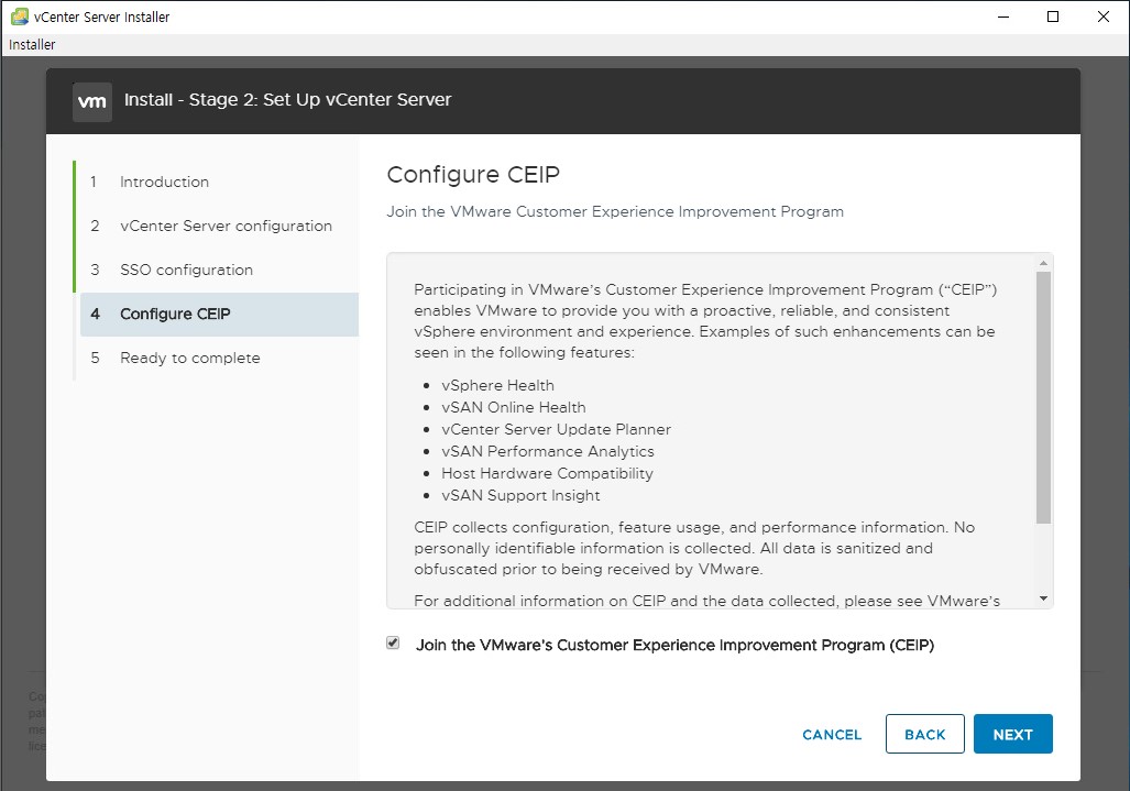 - vCenter Server 설치는 두 단계로 진행됩니다. 첫 번째 단계에서는 vCenter Server를 대상 ESXi 호스트 또는 대상 vCenter Server의 컴퓨팅 리소스에 배포하는 작업이 포함됩니다. 두 번째 단계에서는 배포된 vCenter Server의 설정을 완료합니다.