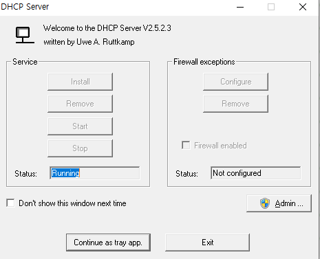 10) DHCP Running 상태 중 이며, Continue as tray app 선택