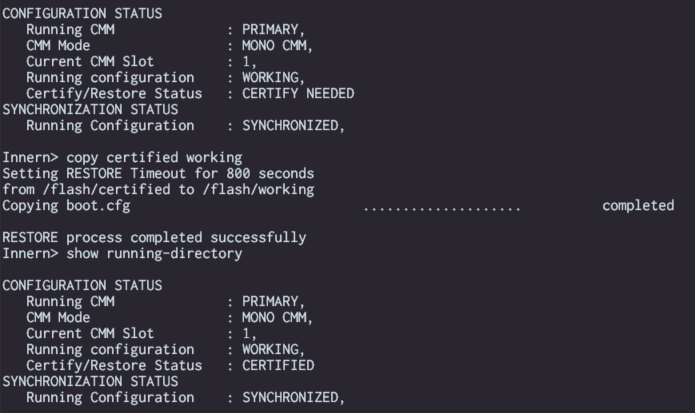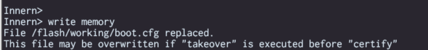 " reload all " 명령어로 reload 하였으면 certified 모드로 진입하시게 되는데, 그러므로 저장을 위해서는 working 모드로 진입하시는 명령어로 리부팅 하셔서 저장과 컨피그를 하시면 됩니다.