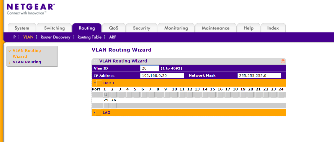 VLAN에 ip를 할당하기 위하여 라우팅 항목으로 들어가서 vlan ID와 ip를 기입하고, 설정하려는 포트를 눌러 untag / tag를 설정해주시면 됩니다. 상단의 방법도 vlan을 만들 수는 있지만, 라우팅 항목에서 곧바로 vlan과 ip주소를 설정할 수도 있습니다.