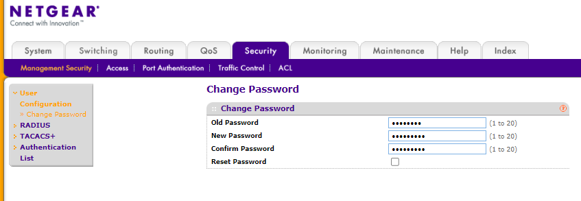 GS724Tv4 의 초기패스워드는 password 입니다. 보안을 위해 Security 항목에서 패스워드를 변경하실 수 있습니다.