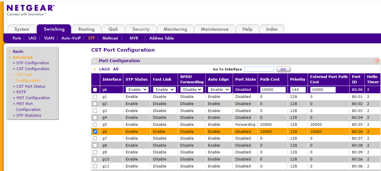 Switching 항목에서 STP를 설정할 수 있습니다.