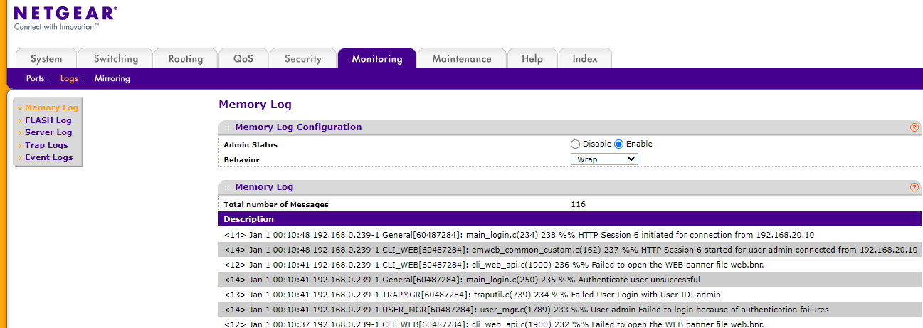 스위치의 장애나 트러블 슈팅을 할 때, monitoring 항목에서 로그를 확인할 수 있습니다.
