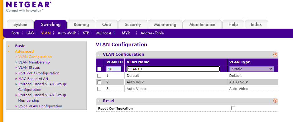 스위치의 VLAN 설정을 하는 방법입니다. Switching 항목에서 VLAN으로 들어가시면 설정할 수 있습니다.