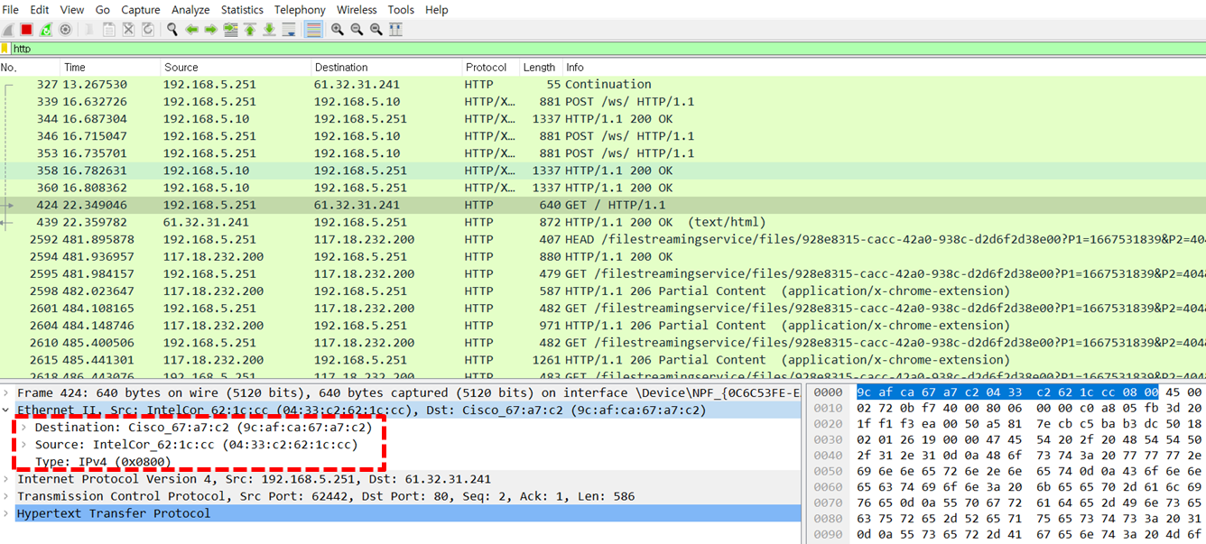 위와 같이 이더넷 프레임 헤더의 구성요소가 출력 되는 것을 확인할 수 있다.