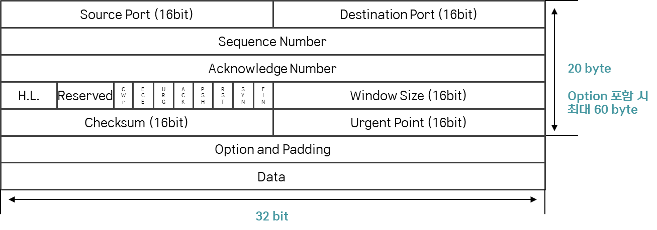 - Header Length: TCP헤더의 전체 길이를 byte단위로 표현