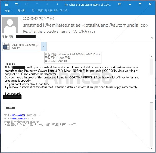 [그림 4] 코로나19 보호장비 업체를 가장한 이모텟 악성코드 유포 메일