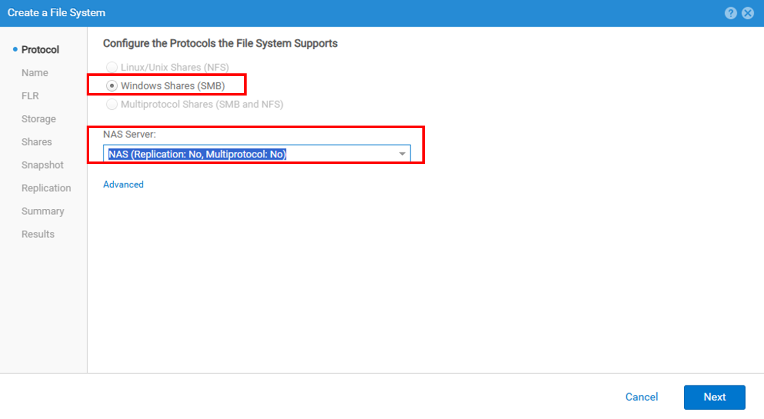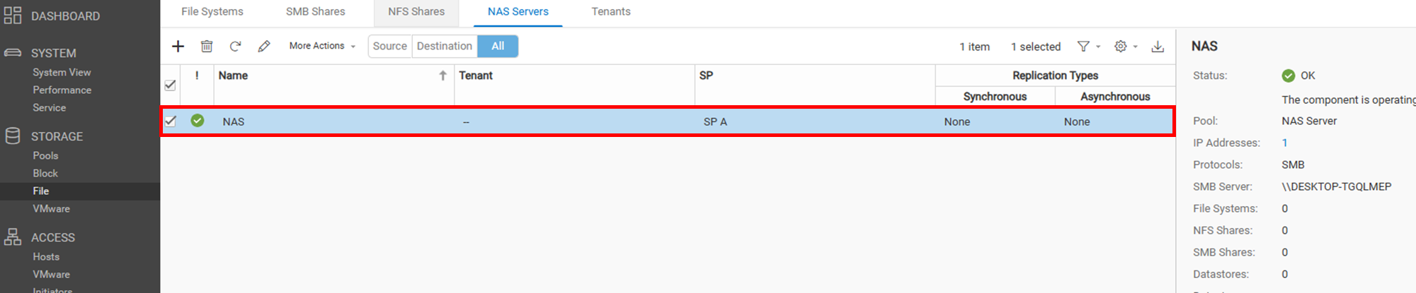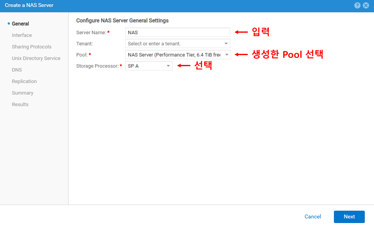 - 사용할 NAS Server 이름, Pool, Storage Processor을 선택합니다.