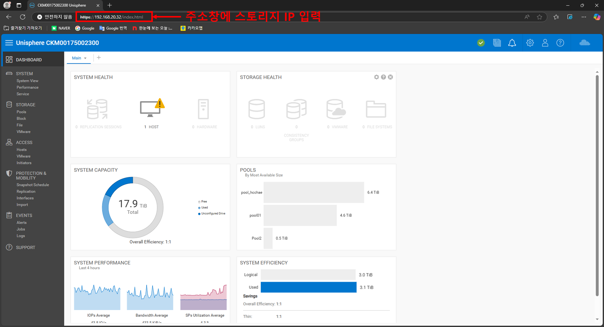 - 노트북에서 Chrome 또는 Edge를 열고 주소창에 스토리지 IP를 입력하여 사용자 인터페이스에 접속합니다.