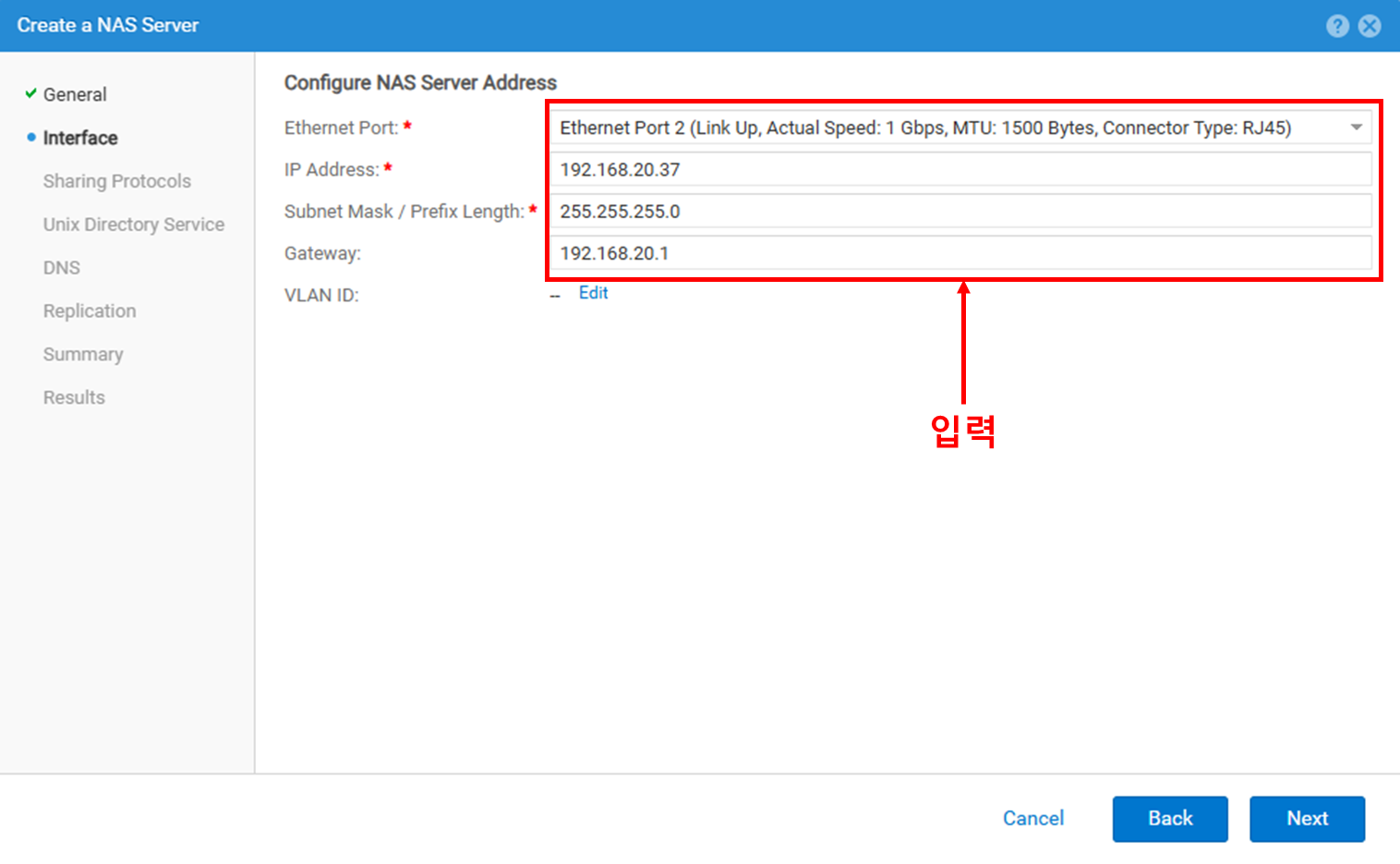 • 사용할 NAS Server 이름, Pool, Storage Processor을 선택합니다.
