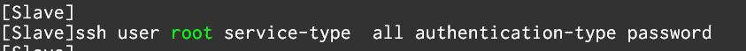" ssh user [유저네임] service-type all authentication-type password " 를 명령어로 root 유저를 ssh 에 설정해줍니다.