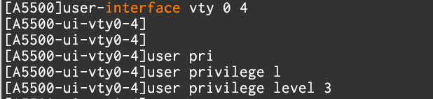 " user-interface vty 0 4 " 명령어를 통해 가상서버 인터페이스 진입 후, user 의 권한레벨을 설정 할 수 있습니다.