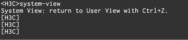 <H3C> 에서 system-view 명령어를 입력하면 [H3C] 로 바뀌며 config 모드로 변경되는 것을 확인할 수 있습니다.