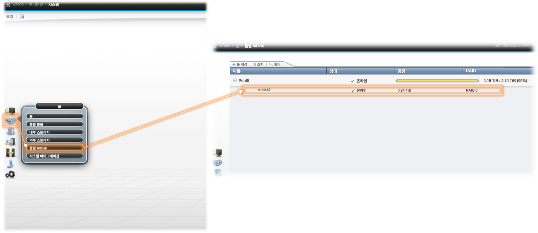 위 사진처럼 풀별 MDisk를 선택하면 기존에 생성되어 있는 mdisk를 확인할 수 있습니다.